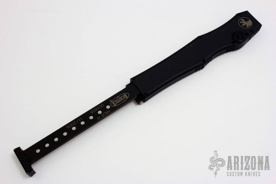 This Halo III has a black DLC partially serrated blade and is dated 11/2006 and S/N 001458. Has a black aluminum handle and all black hardware. Includes original box, sheath, and paperwork. Has some scuffs/scratches, good condition.