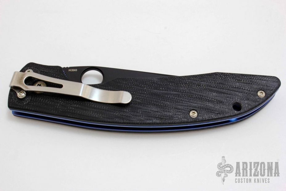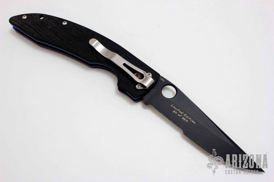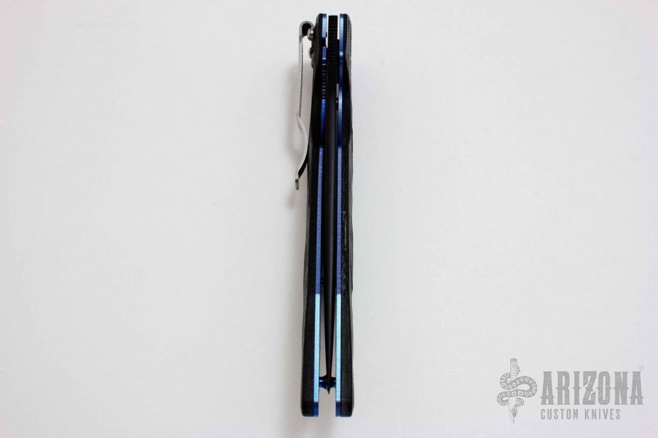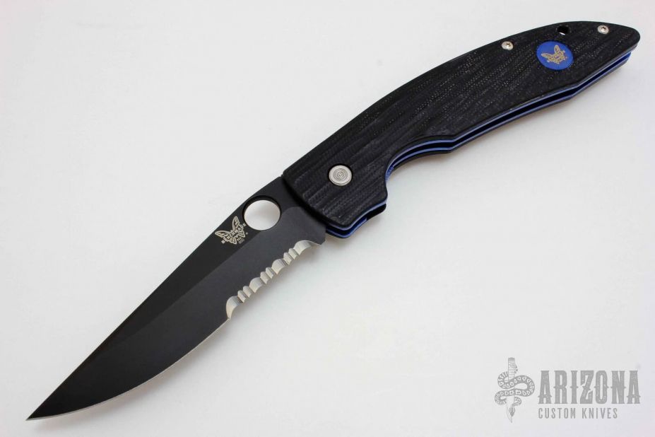 This Benchmade AFCK LLK Limited Edition (80 of 250) linerlock folder has a black DLC M390 Stainless Steel clip point blade with partially serrated edge, notched thumb rest and thumbhole. Handle is black G10 with anodized titanium liners, blue anodized titanium barrel spacers, lanyard hole, and tip down stainless steel clip. Excellent condition.