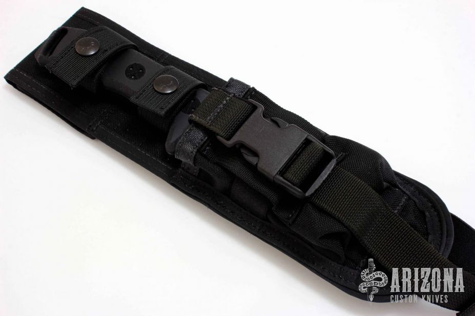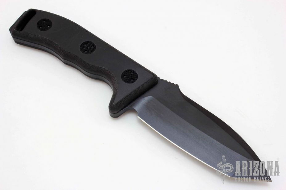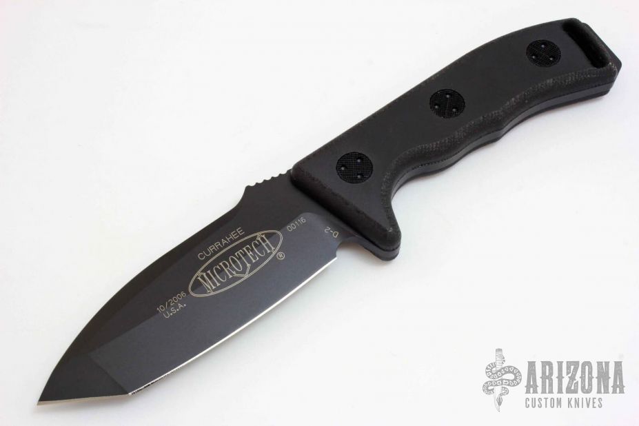 "The Currahee is a full tang fixed blade originally designed for U.S. Special Forces Boat team 20. The original run of the CURRAHEE was limited, with the first few put in the hands of those best suited to test the knife, the United States Special Forces. Field use has proven that these knives can endure extremely high intensity, and adverse conditions. Currahee is a Cherokee name, which translates “Stands alone”. CURRAHEE is also the name of the last mountain in the Blue Ridge chain of mountains, where the US Army established Camp Toccoa during WWII; here, the first Parachute Infantry was trained. "This black tactial Currahee has a tanto plain edge blade and is dated 10/2006 with a serial number of 00116. Includes original box and paperwork and nylon tactical sheath. Excellent+ condiiton Blade Steel: .200 D2 Tool Steel @ 59-60 RC"