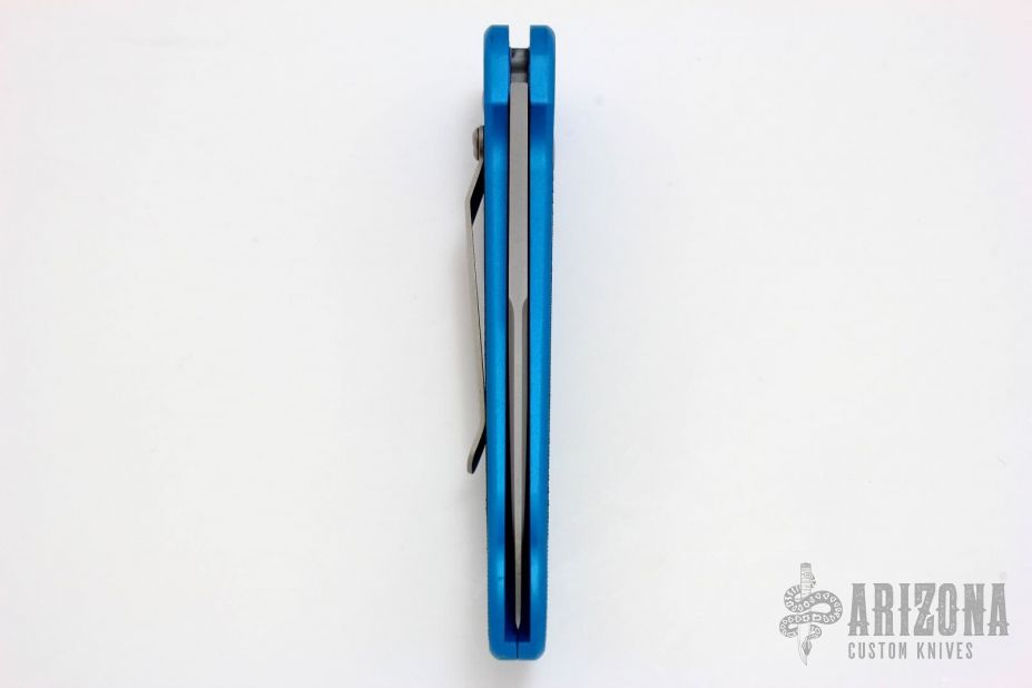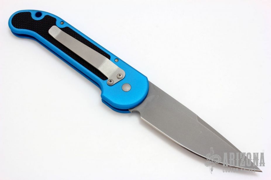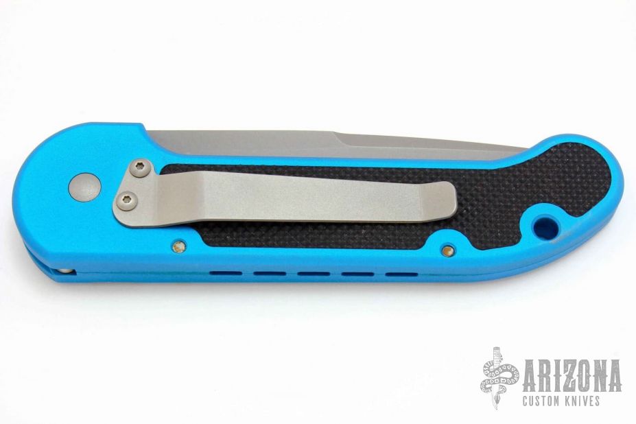 This L-UDT is dated 2/98. Side opening auto features a spear point bead blast blade with plain edge. The handle is blue aluminum with non-slip inlays. Has tip down stainless steel clip. Excellent condition.
