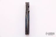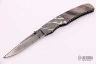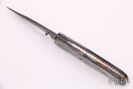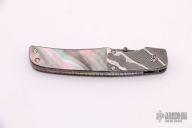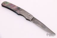 This Gentleman's Folder from Joseph Szilaski features a clip point damascus blade with single thumb stud. The handle is comprised of damascus bolsters and black lip pearl scales over fileworked and anodized titanium liners and fileworked steel backspacer. Some minor marks on bolsters, but otherwise excellent condition. Includes padded and zippered case.