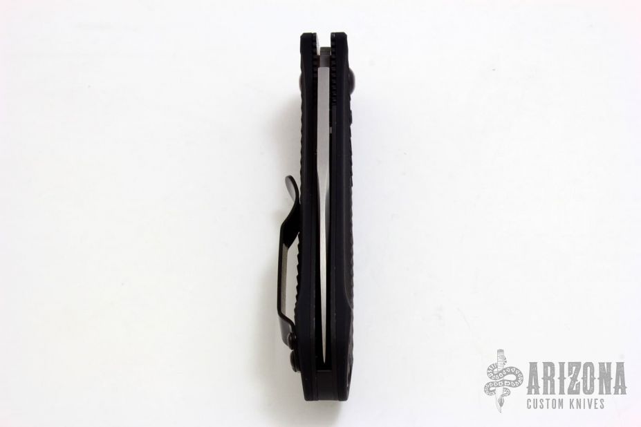 This Prisidio Auto has a bead blast 154-CM drop/ spear point blade. Handle is contoured black anodized aluminum with black backspacer, saftey, and black stainless steel tip up (RH/LH) clip. Excellent condition. Comes with original box and papers.