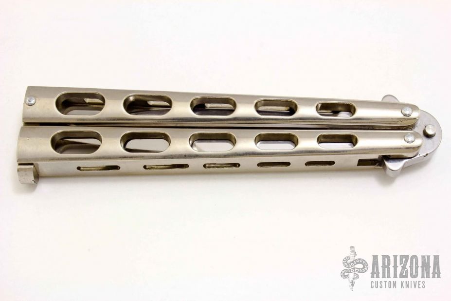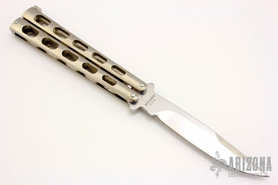 This Model 239 balisong features a polished stonewashed blade. The Zanak handle has polished finish and latch The handle and blade have some light scratches. Comes with black nylon sheath. Good condition.
