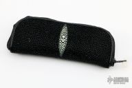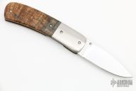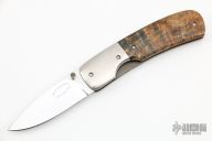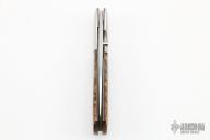 This linerlock folder from Gavin Dickerson features a polished stainless steel drop point blade with checkered right hand thumbstud. The handle is comprised of titanium bolsters and wood scales over titaniuml liners and steel backspacer. Light scuffs on bolsters and blade, but otherwise good condition. Includes zippered rayskin case.