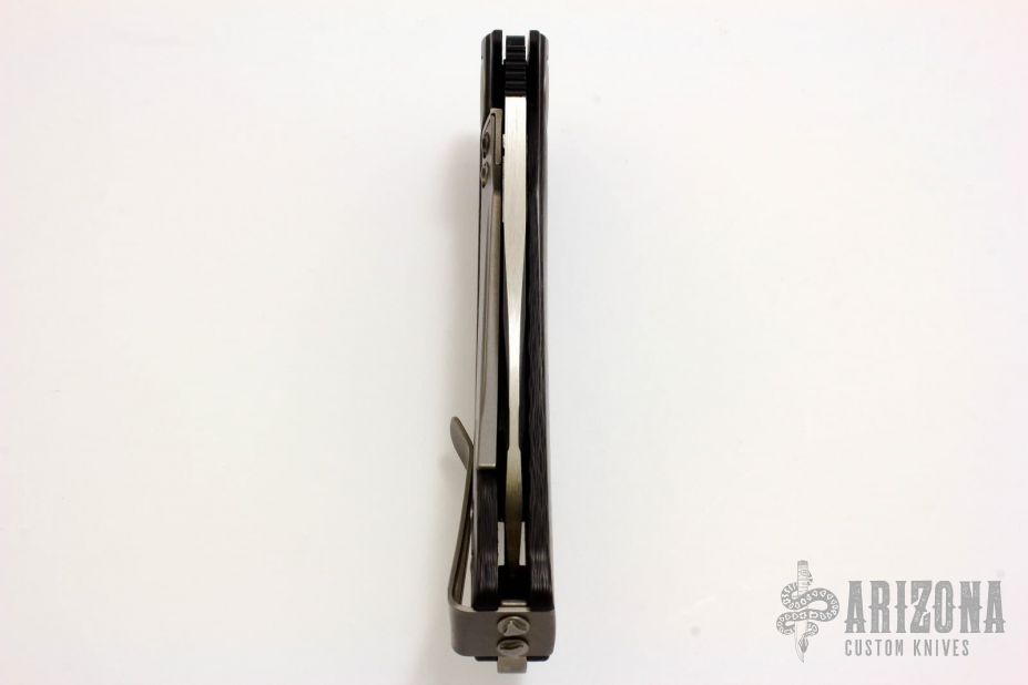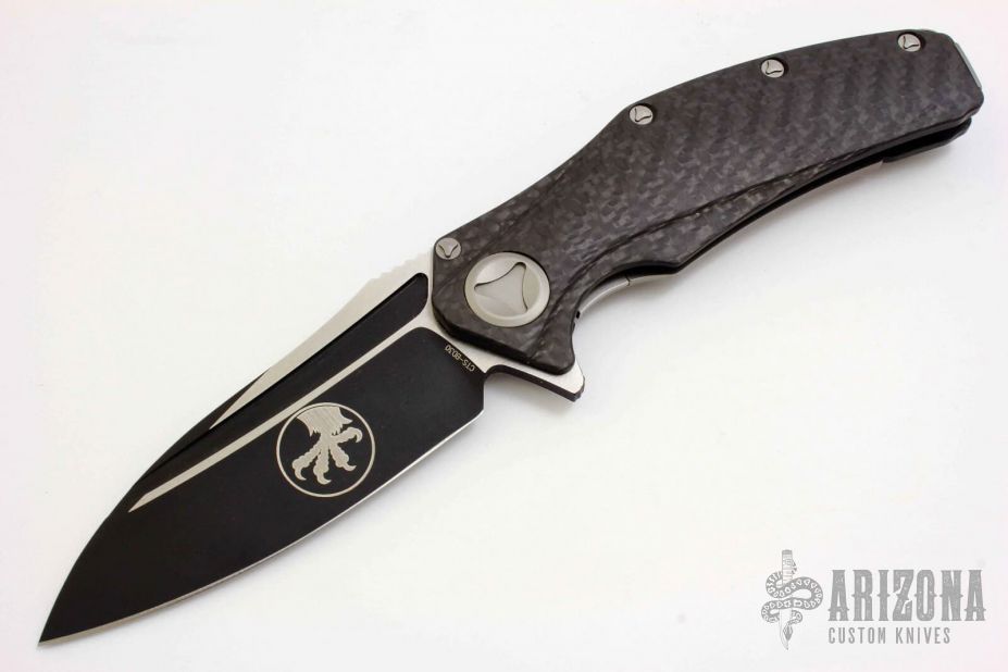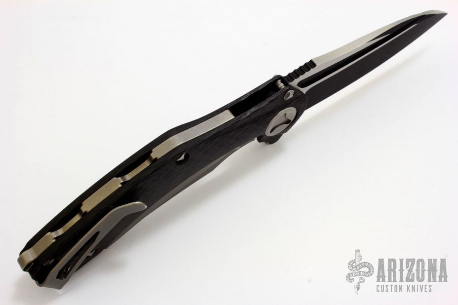 This Matrix by Microtech Knives has a black blade with satin finished flats, notched thumbrest and flipper. The handle has a carbon fiber frame with bead blasted hardware, tip up titanium clip and backspacer. Comes with original box, sheath, and papers. Nice detent, lockup and blade seating. This is a Semi Custom model that is an early full size Matrix with the old blade style. Excellent condition.