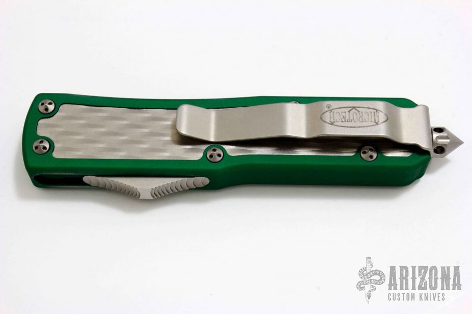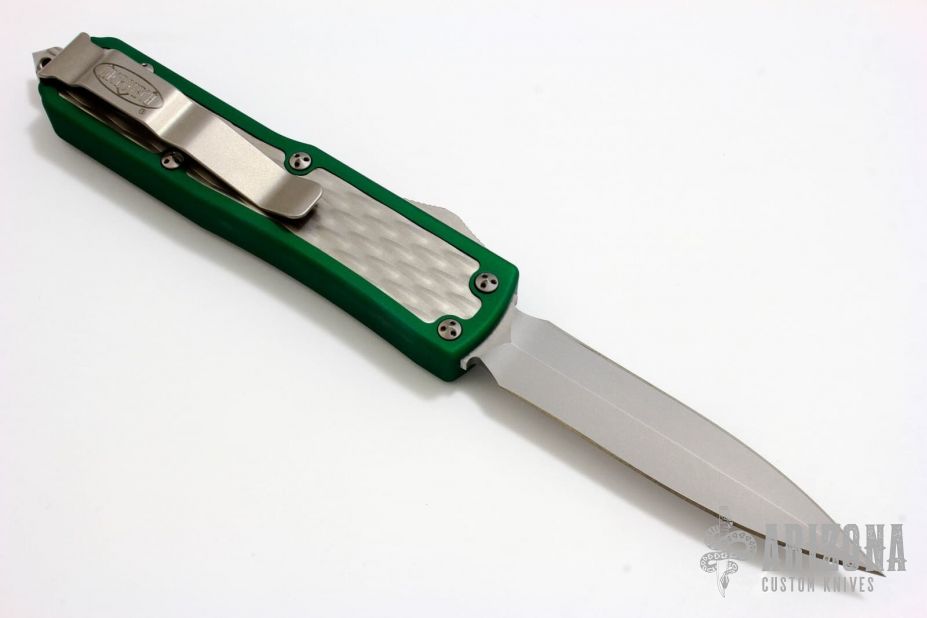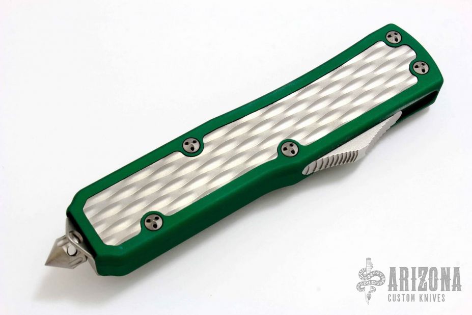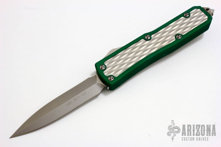 This Daytona OTF automatic features a D/E bead blast blade with a standard edge, and a green handle with bubble inlays. Glass breaker. Marked "USN 2011 G3" on blade. Excellent condition.
