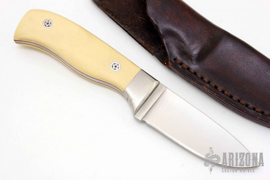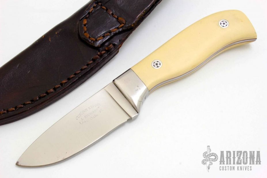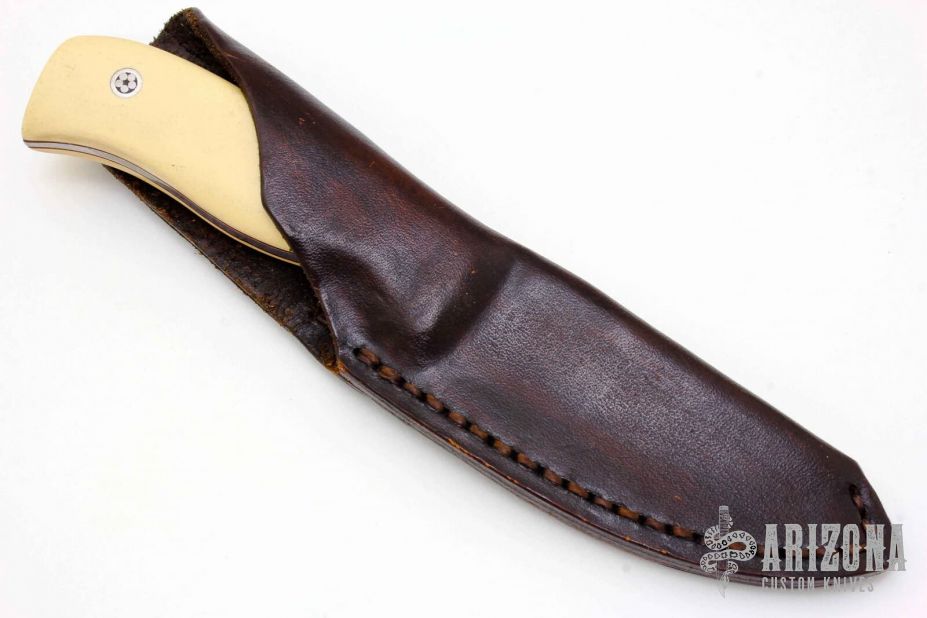 This small fixed blade from L. Stewart features a satin finish drop point blade. The handle is comprised of stainless steel bolsters and ivory micarta scales with mosaic pins over red liners and full tang construction. Leather sheath with belt loop. Scuffs on blade and bolsters and staining on handle.