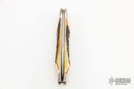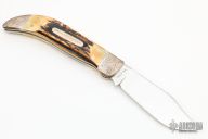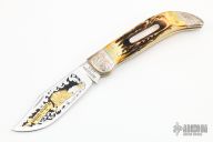This knife by Schrade Cutlery was commemorate their 75th Anniversary. It features a mirror polished clasp etched blade with nail nick and gold inlays and fileworked spine. The handle has engraved sterling silver bolsters and cap, sambar stag scales with sterling silver plate, sterling silver liners, stainless backspacer. Ecellent condition. Comes with leather zippered case.