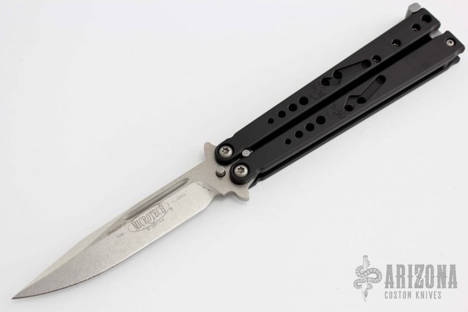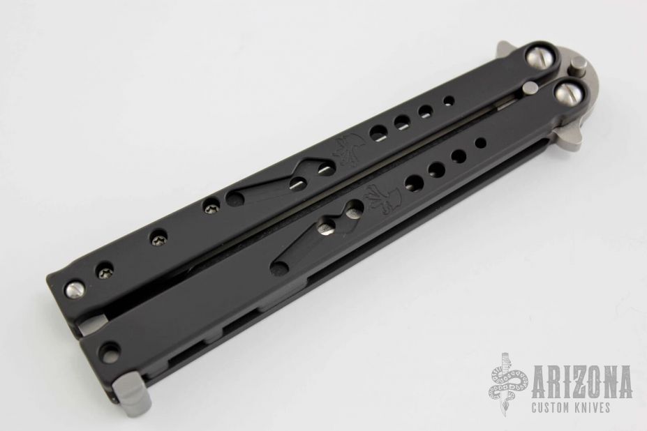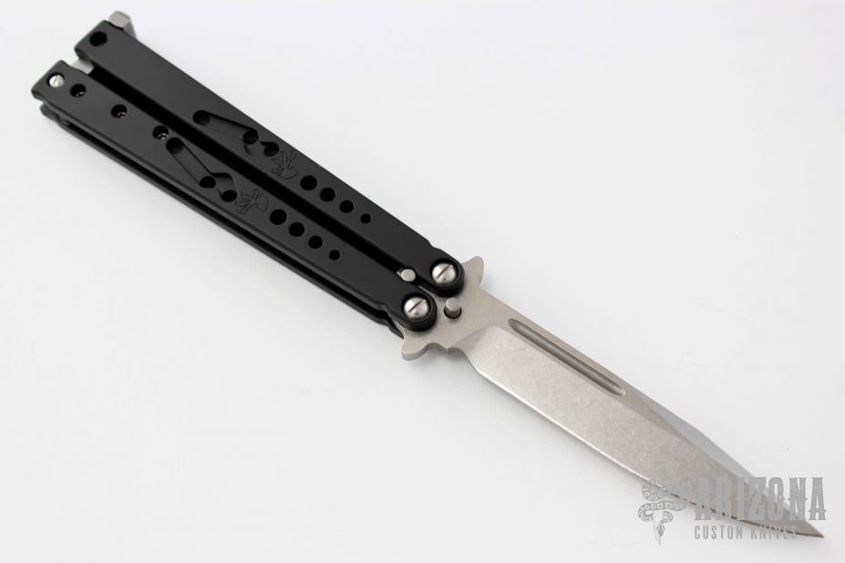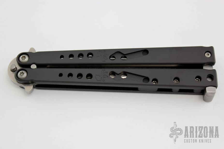 This Dragonfly Balisong #549 12/2002 has a stonewashed 14-4CrMo clip point blade with swedge and blood grooves. Handle is black anodized aluminum with T-latch. Excellent condition. Comes with original box, sheath and papers. Blade Steel: 14-4CrMo