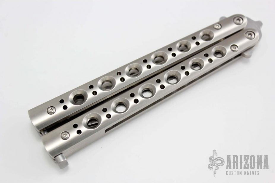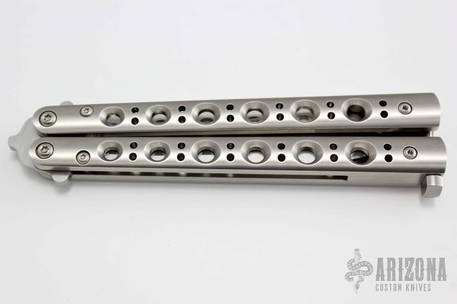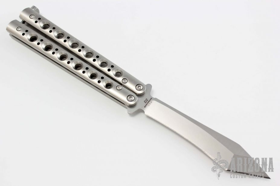 This Model 67 Balisong by Benchmade features a tumble finished tanto recurve blade and stainless handles with T-latch. Nice and tight. Comes with original sheath, box and papers. Excellent condition.
