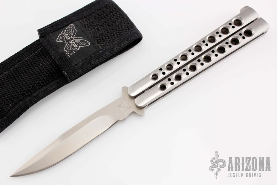 This Model 45 Balisong from Benchmade features a satin finish drop point blade with swedge. The handle is comprised of integral steel handles with T latch on pommel. Includes nylon sheath with belt loop. Scuffs on blade and handle. Blade has been resharpened.