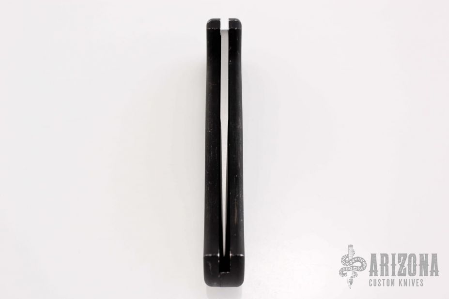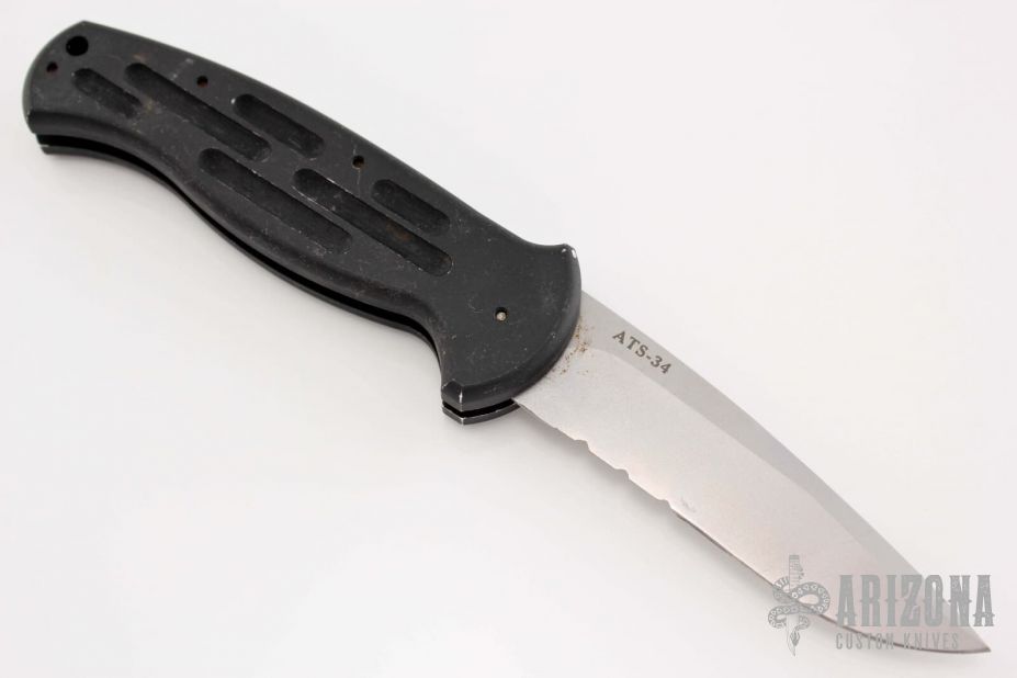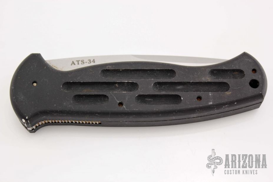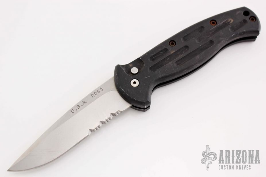 This AFO Automatic from Benchmade features a bead blast finished drop point blade with swedge and partial serrations. The handle is comprised of black anodized aluminum with a lanyard hole in pommel. Has some scuffs and scratches, has been resharpened. #0064 on blade.