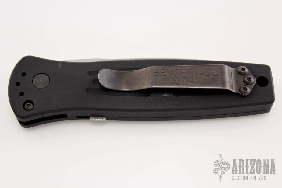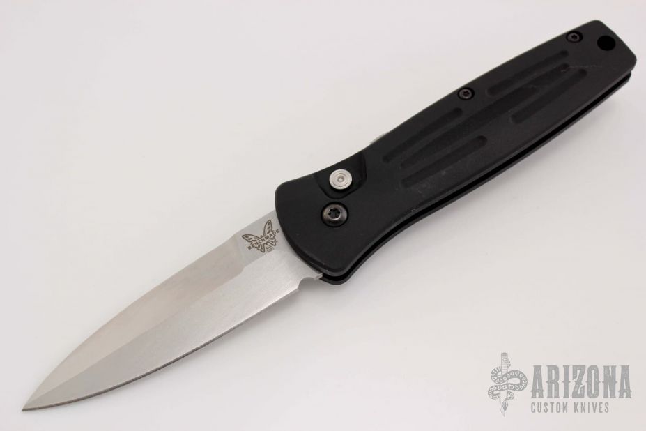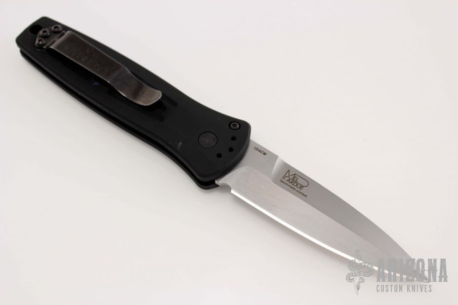 This 3551 Mini Stimulus features a stonewashed spear point blade with false top edge and a black aluminum handle with push button and safety, tip up or down reversible black stainless steel clip, lanyard hole at the butt. Comes with original box and papers. Excellent condition.