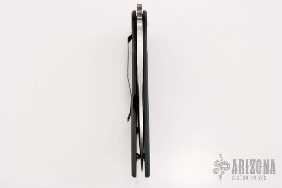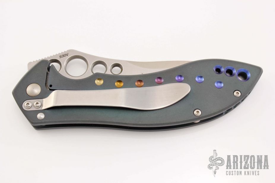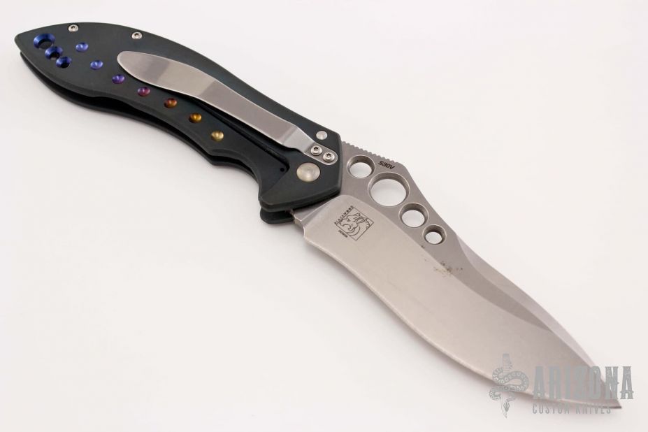 This 630 Skirmish by Benchmade is a Neil Blackwood design, it features a tumble finished recurve blade with thumbhole. The handle is anodized and bead blasted titanium with a tip down stainless steel clip. Has a few scuffs, scratches and oxidation spots on the blade. Nice detent, lockup and blade seating. Good condition.