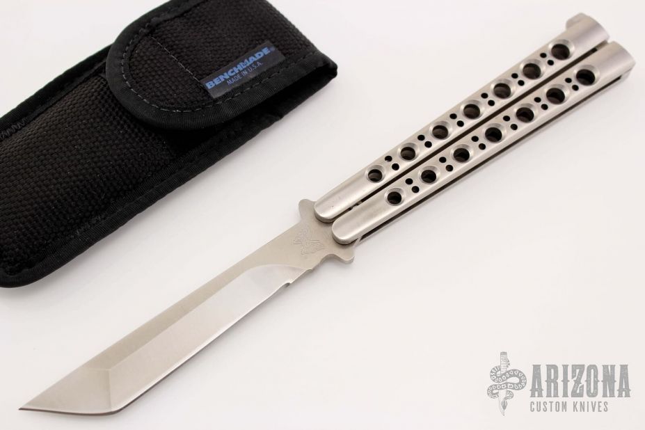 The model 44 by Benchmade is rare and hard to find.  Tanto style blade. Stainless steel skeletonized handles with T latch.  Comes with original box, sheath and papers. Excellent condition.