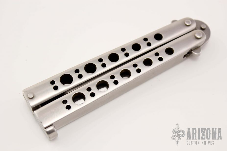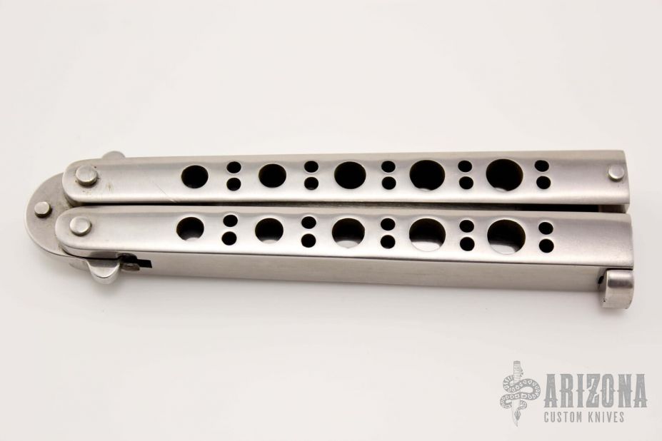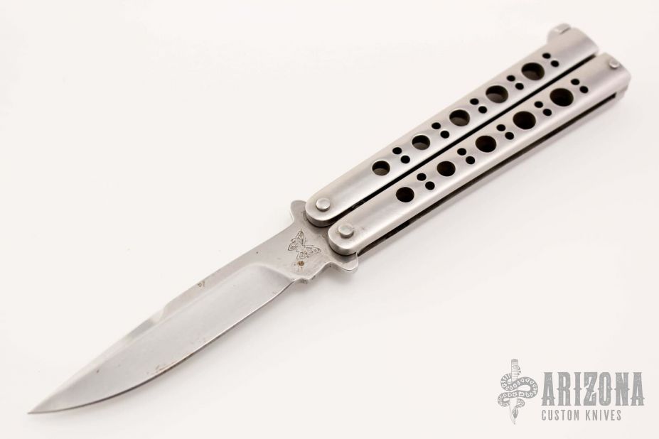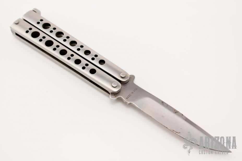 This is a Benchmade Model 10 Bali-Song with a plain edge blade. The handles are stainless steel with a T-latch. Has some scratches on the blade and frame. Flips nice. Good condition.