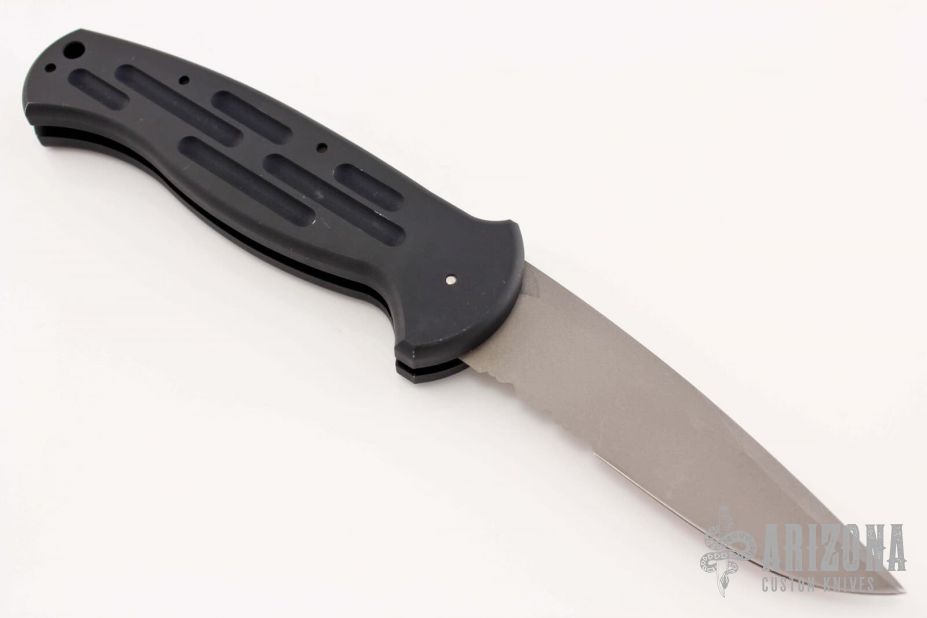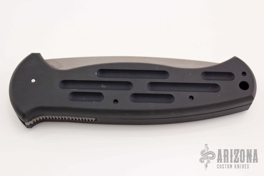 This Early Sterile AFO Automatic from Benchmade features a bead blast finish drop point blade with swedge. The handle is comprised of black anodized aluminum with a lanyard hole in pommel. Has a few light scuffs, otherwise excellent condition. Comes with black nylon sheath.