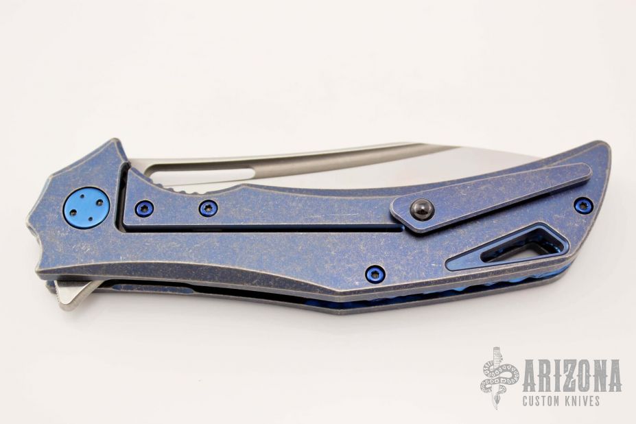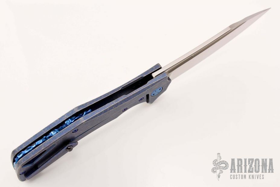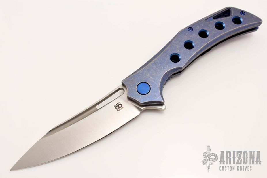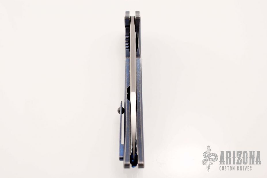 This Swish Flipper from Olamic Cutlery features a satin finished clip point blade with milled fullers, thumb hole and flipper. The handle is comprised of a tumbled and anodized titanium frame over a fileworked and anodized floating titanium backspacer. Matching  titanium tip up clip with ceramic ball. Screws and pivot have been anodized to match the backspacer. Great detent, lock up and blade seating. Marked "Swish S016" inside the backspacer. Includes padded and zippered case, Olamic pivot too and maker's card dated 5-24-17. Excellent condition.