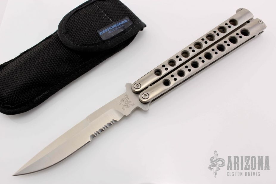 This 42S Bali-Song by Benchmade has a satin finished partially serrated blade and satin finished titanium handles with T-latch. Includes original box, paperwork, and sheath. Excellent Condition.