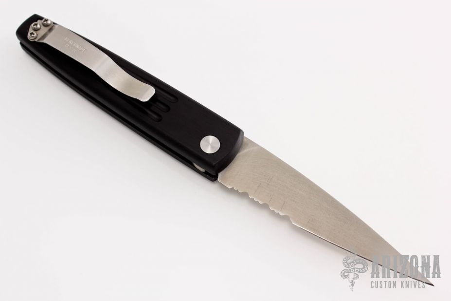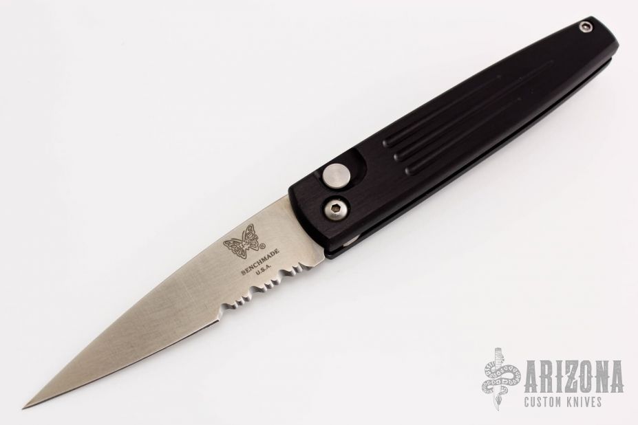 This Spike automatic by Benchmade Knives features a satin finished partially serrated blade and black anodized aluminum frame with black stainless tip up clip. Has a few light scuffs, otherwise excellent condition.