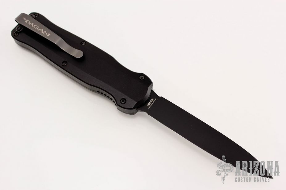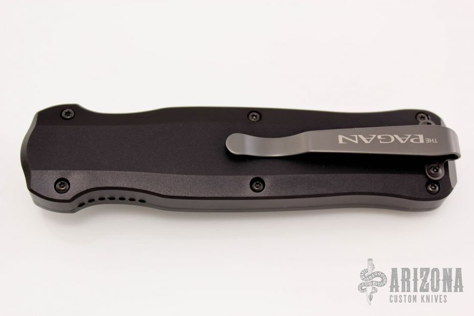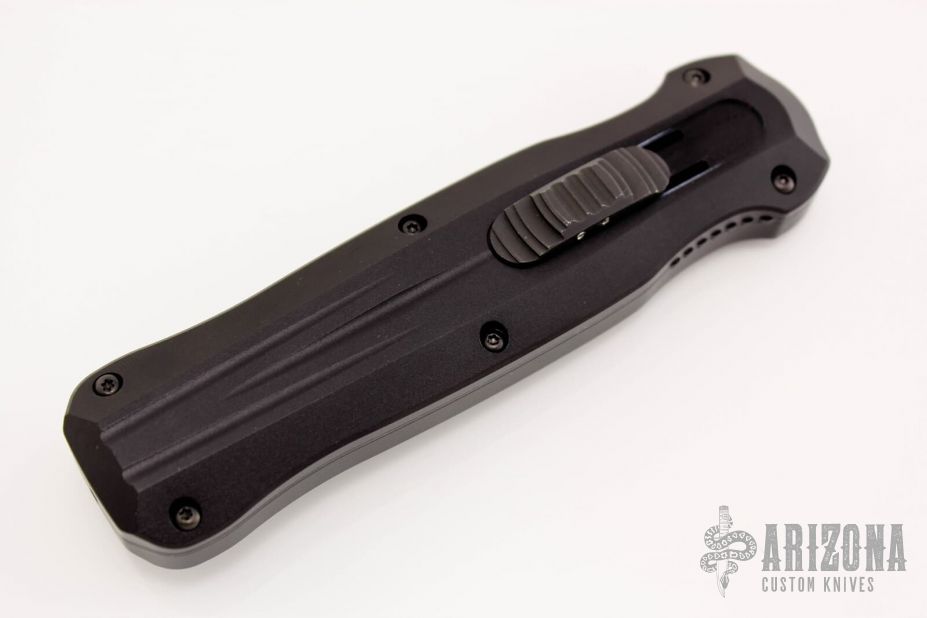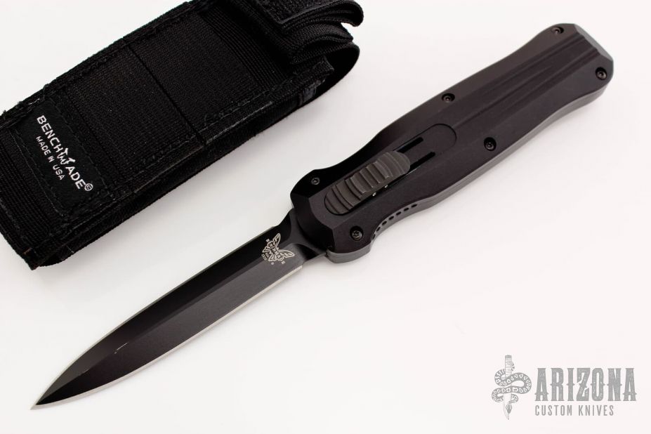 This 3320BK from Benchmade features a black coated, chisel ground spear point blade. The handle is comprised of milled and black coated aluminum. Includes original box and MOLLE compatible nylon sheath. Some minor marks in blade coating from automatic action, but excellent+ great condition.