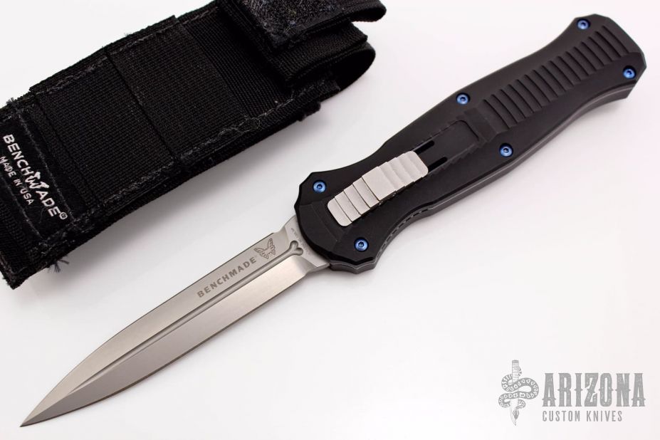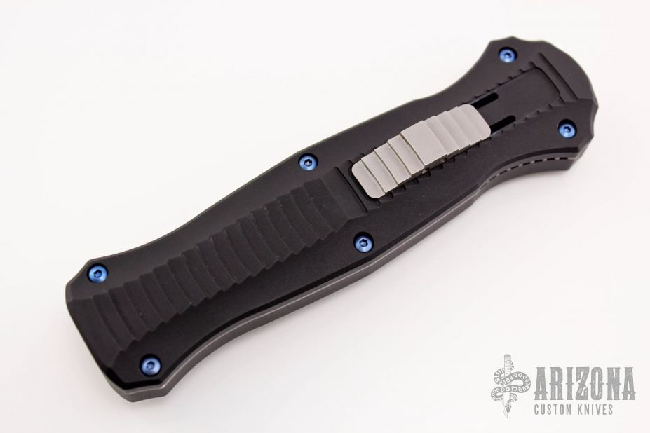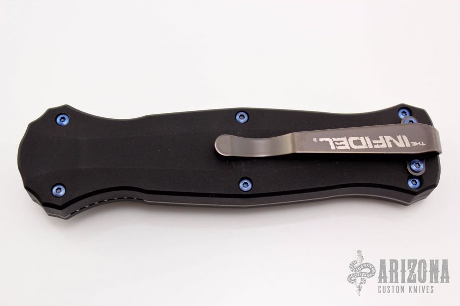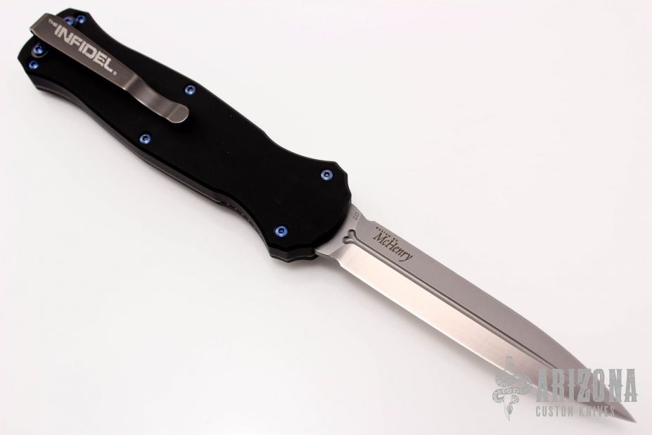 "Introducing an OTF like none-other.. The new Infidel® is rapidly making believers out of many a skeptic. Built for strength and reliability the patent pending double-action mechanics get it done over the long haul. Grab on and you will find the handle grip rock-solid with its patented machined in Presidio® style bi-directional tread pattern, and overall generous sizing for gloved hands. Intuitively pressure the release-slide forward and its spear-point edged steel fires and locks up with a unique three-point retention system with amazingly negligible blade play. Reverse the process and the blade retracts in a rapid blur of motion.Matte spearpoint blade with fullers. Black aluminum handle with blue anodized titanium screws. Includes original box, papers and nylon sheath.