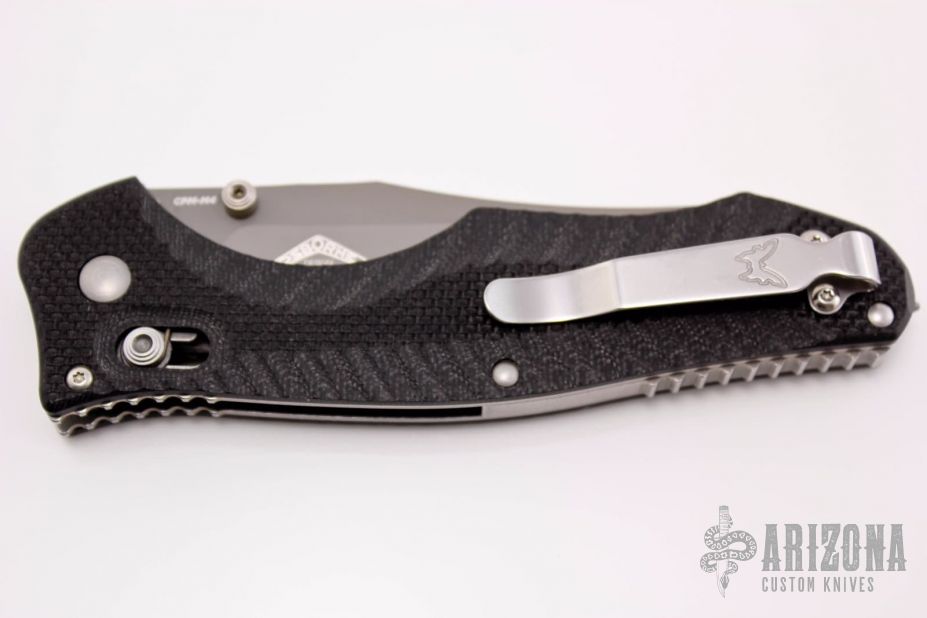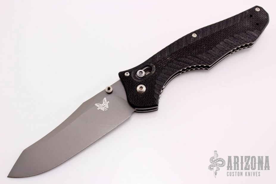 This Contego from Benchmade features a grey coated plain edged blade. Black G-10 handle textured in the center and grooved on edges for a better grip. Carbide glass breaker on pommel. Perfect function and strong lock up. Includes original box and paperwork. Never used or carried. Excellent Condition.