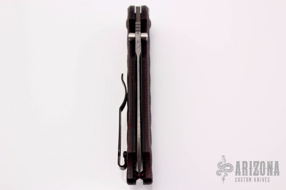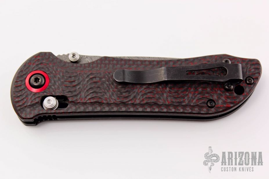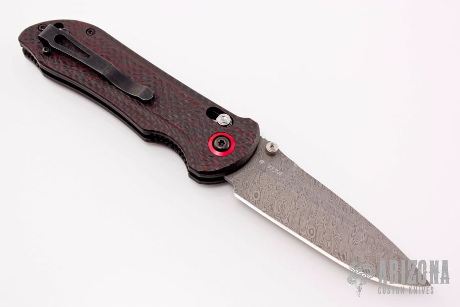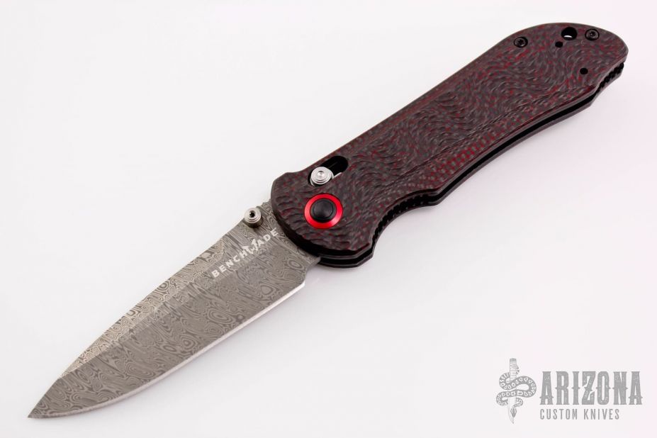 This Gold Class Stryker II from Benchmade features a drop point damascus blade with swedge and dual thumb studs. The handle is comprised of red and black carbon fiber scales over blackened stainless steel liners and red anodized aluminum barrel spacers with matching pivot collar. Reversible tip up stainless steel pocket clip. Numbered #1174 on blade. Includes original box and paperwork. Excellent condition.