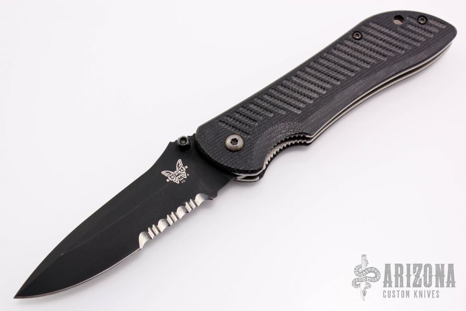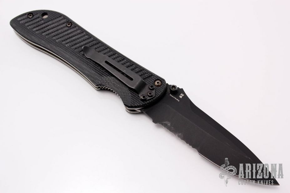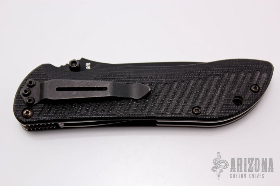This Nitrous Stryker by Benchmade features a black finish blade with partially serrated edge. Textured black G10 scales and titanium liners with a tip down black stainless steel clip. Has some light scuffs on the blade. Nice detent, lockup and blade seating. Excellent condition.