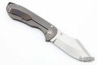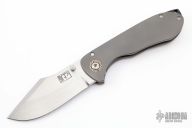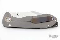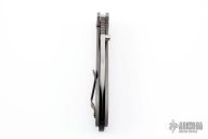 This knife features a satin finished clip point blade with false top edge and notched thumbrest. The frame consists of bead blasted titanium and is complimented by a matching tip up pocket clip with light anodization. The backspacer is composed of lighting strike carbon fiber. Mokume pivot collar. Comes with a nylon zippered case and COA dated 12/21/2013. Nice detent, lockup and blade seating. Excellent condition.