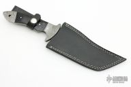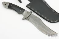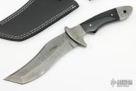 This tanto by Bliss Knives features a Damascus tanto recurve blade with false top edge, .139" blade stock and 1.637" blade depth, full tang construction. The handle has matching Damascus bolsters and buffalo horn scales. Comes with a black leather sheath. Has some scratches, otherwise good condition.