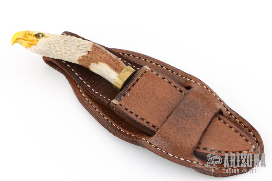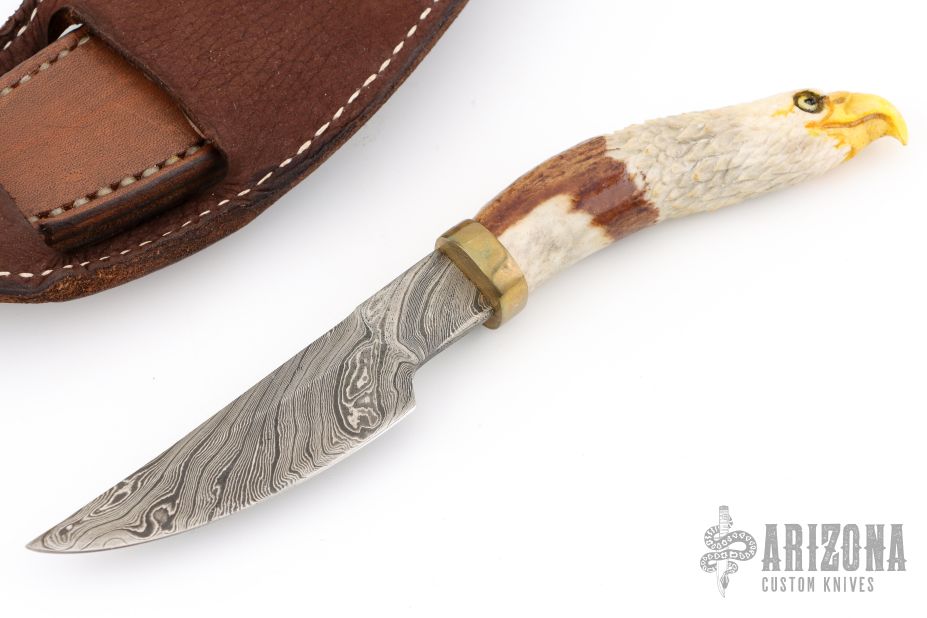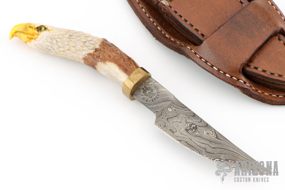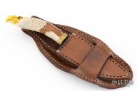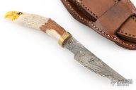 This hunter by JA Lonewolf features a Damascus blade with false top edge, .147" blade stock and .822" blade depth, hidden tang construction. The handle has a brass guard and a carved stag grip. Comes with a brown leather sheath. Excellent condition.
