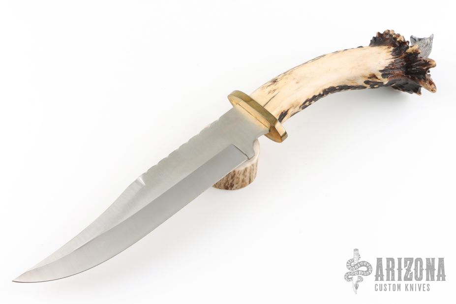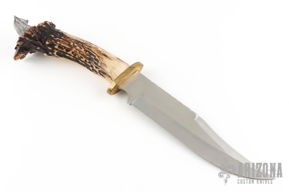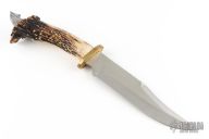 This hunter by JA Lonewolf features a mirror polished blade with fileworked spine and false top edge, .144" blade stock and 1.214" blade depth, hidden tang construction. The handle has a brass guard, stag grip with scrimshaw, has a horn butt cap with red/white/blue spacers. Excellent condition.