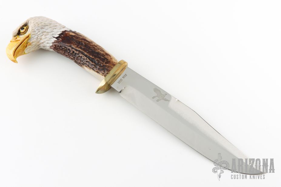 This hunter by JA Lonewolf features a mirror polished blade with a false top edge, .189" blade stock and 1.466" blade depth, hidden tang construction. The handle has a brass guard, stag grip with carved butt. Excellent condition.