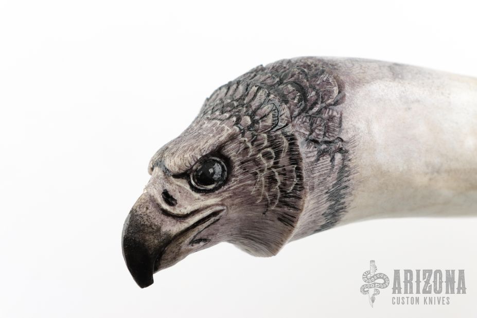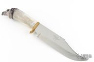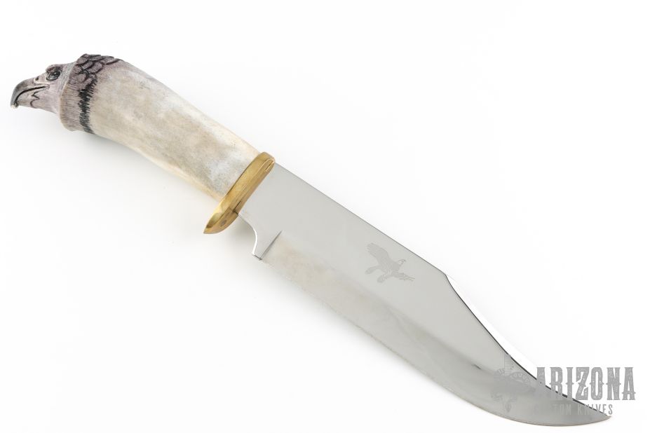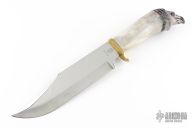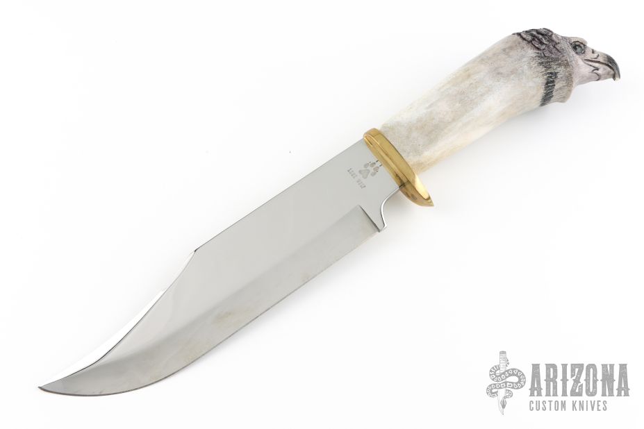 This Bowie by JA Lonewolf features a mirror polished blade with a false top edge, .212" blade stock and 2.079" blade depth, hidden tang construction. The handle has a brass guard, stag grip with carved butt. Excellent condition.