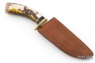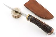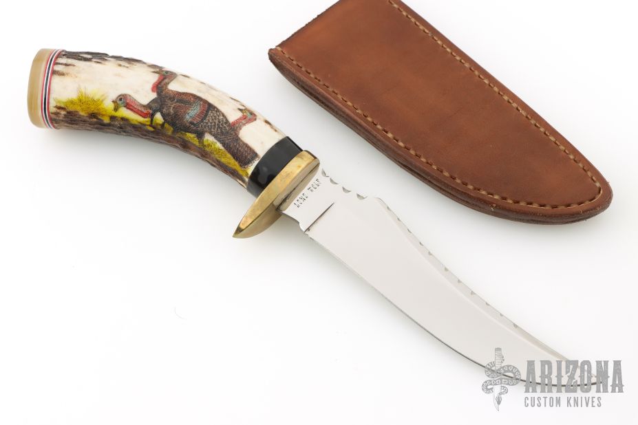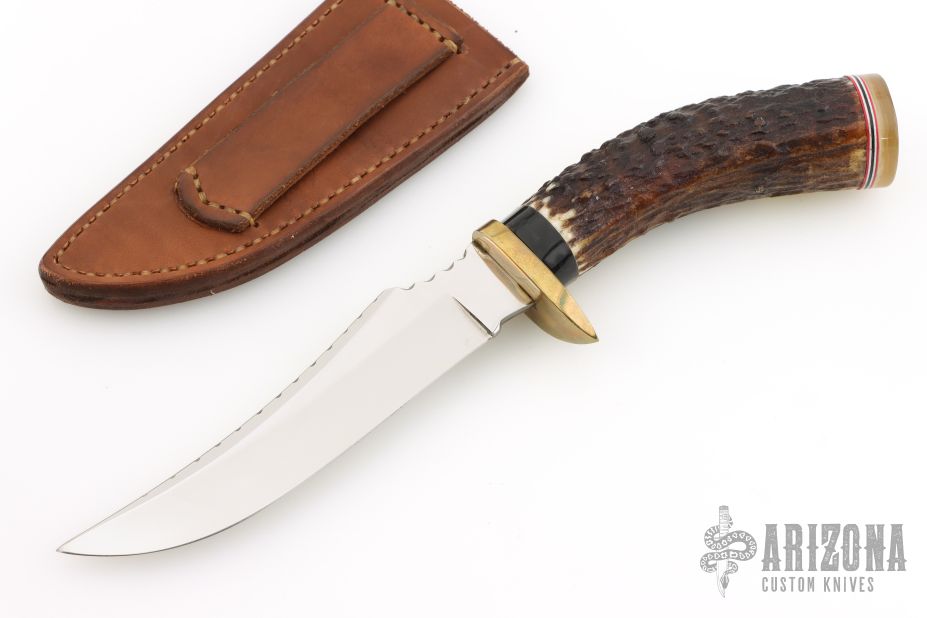 This Hunter by JA Lonewolf features a mirror polished blade with a fileworked spine, .144" blade stock and 1.199" blade depth, hidden tang construction. The handle has a brass guard, stag grip with scrimshaw, horn butt with red/white/blue spacers. Comes with a brown leather sheath. Excellent condition.
