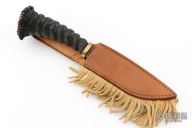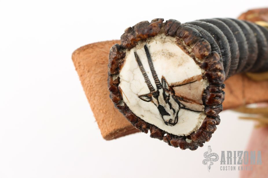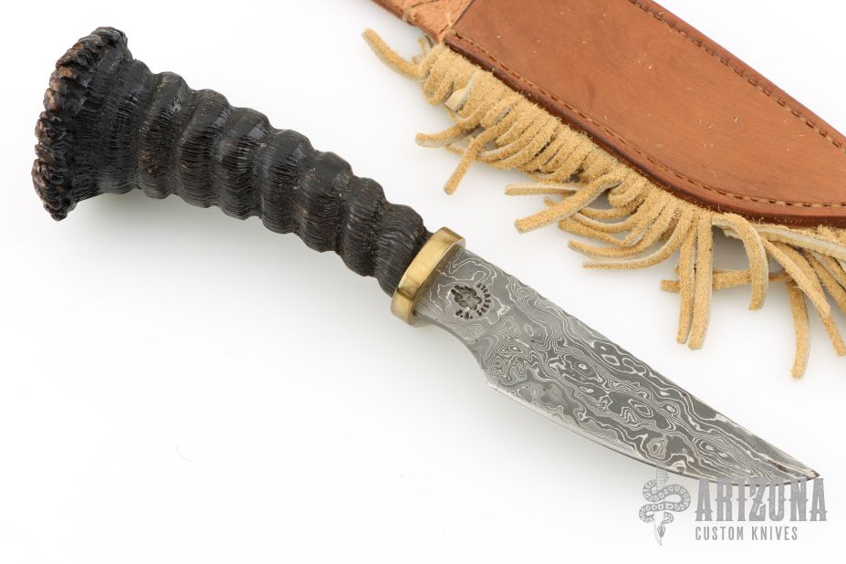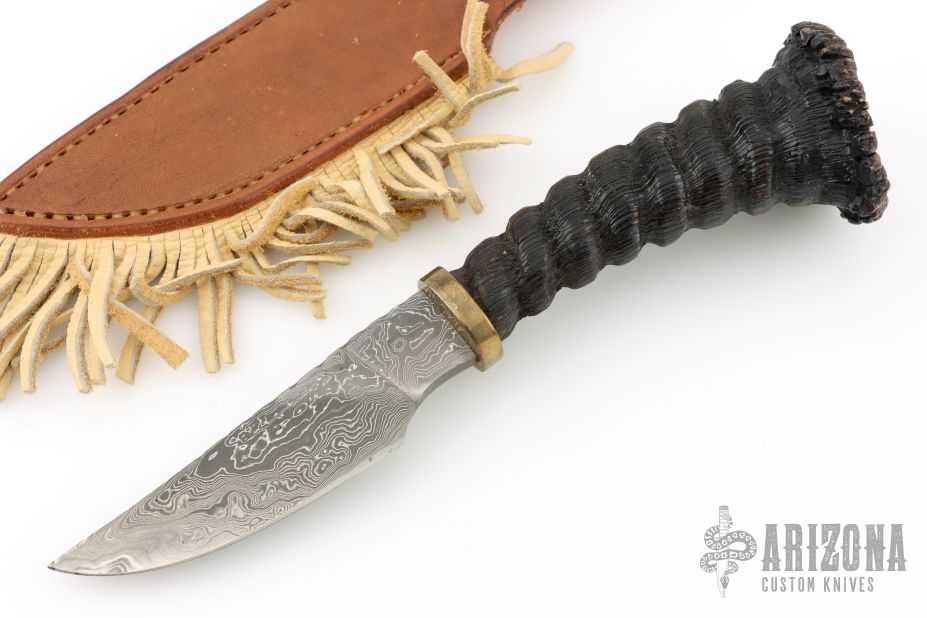 This knife by JA Lonewolf features a Damascus blade with fileworked spine, .220" blade stock and 1.171" blade depth, hidden tang construction. The handle has a brass guard, scrimshawed horn grip. Comes with brown leather sheath. Excellent condition.