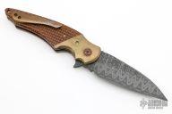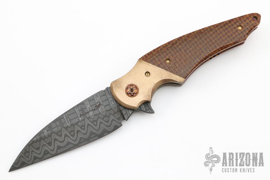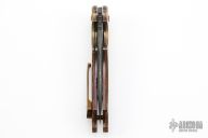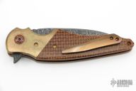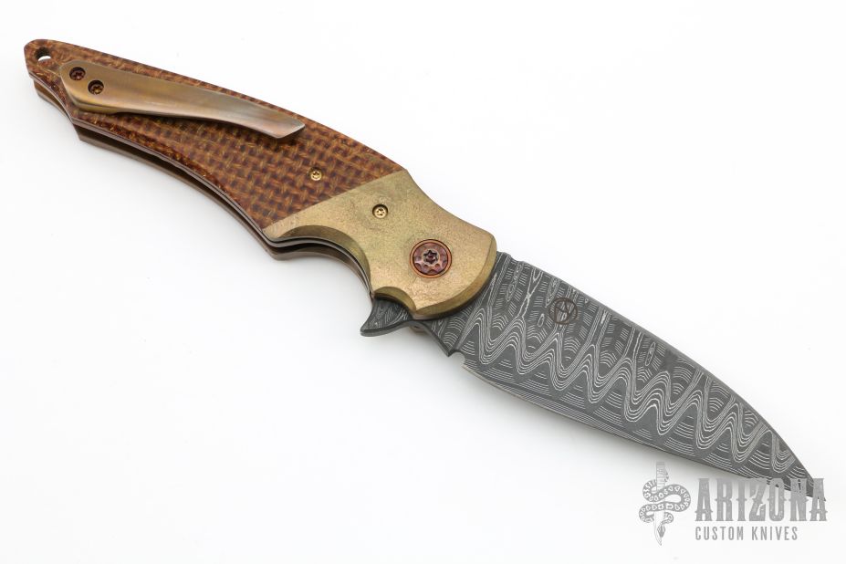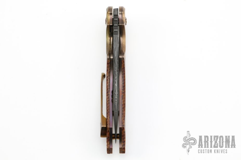 This ARC Flipper from Mike Zscherny (Scorpion Knives) and Faisal Yamin features a wharncliffe style blade with swedge fashioned from Mike Norris Composite Ladder Damascus. The handle is comprised of Antiqued bronze bolsters with gold plated screws, thunderstorm kevlar scales over anodized titanium liners, anodized titanium barrel spacers, bronze anodized titanium pivot, and a 3D tip up anodized titanium pocket clip, copper pivot collars. Includes zippered case and COA. Excellent Condition.
