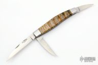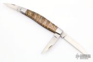 This knife by AC Warren features 3 hand rub satin finished wharncliffe blades with nail nicks. The handle has pinched and dovetailed stainless steel bolsters, mammoth tooth covers with black liners, stainless steel liners and springs. Has half-stops, flush in all positions. Comes with a zippered case. Excellent condition. First folder he ever made! Made in November of 1994