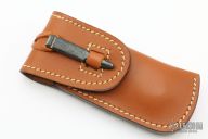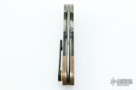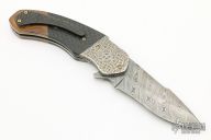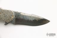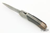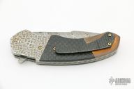 This linerlock flipper by Patrick Famin features Damascus blade with flipper. The handle has mosaic Damascus bolsters, copper rear bolsters, lightning strike carbon fiber scales and tip up clip, titanium liners with jeweled interiors, Damascus backspace. Nice detent, lockup, action and blade seating. Comes with a leather sheath. Has some staining on Damascus pieces, otherwise good condition.