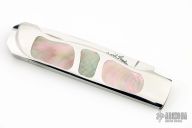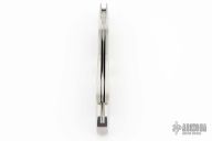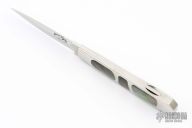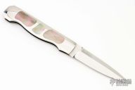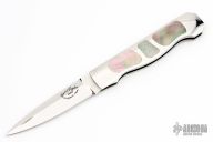 This interframe lockback by David Taylor features a mirror finished blade with false top edge. The handle has a stainless steel frame with black lip pearl inlays, and a stainless steel backspacer. Nice lockup and blade seating. Comes with a leather zippered case. Excellent condition.
