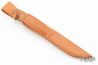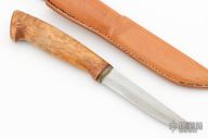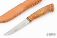 This knife by Kellam Knives features a hand forged drop point blade. .11" Blade Depth .72" Blade Depth. The handle features a brass guard complemented by curly birch. This knife knife features a hidden tang construction. Includes a brown leather sheath. Light scuffs are visible on the handle and blade otherwise the knife is in excellent condition.