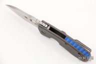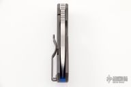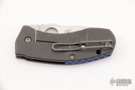 This Techno from Spyderco features a tumble finish blade with thumb hole. Tumble finish titanium frame with notched blue G-10 backspacer. Comes with original box and papers. This model is now discontinued. Excellent Condition.