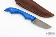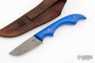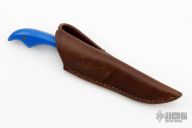 This Caper Field knife EDC ULTRA light by Doberman Forge features a tumble finished blade with .067" blade stock and .816" blade depth, full tang construction with blue G-10 scales. Comes with a brown leather sheath. New from maker.