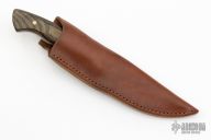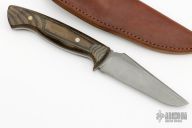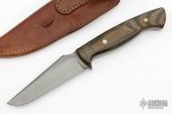 This Beagle V2.0 by Doberman Forge features a tumble finished clip point blade with notched thumbrest and false top edge, .132" blade stock and 1.165" blade depth, full tang construction. The handle has black/green linen micarta scales. Comes with a brown leather sheath. New from maker.