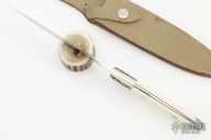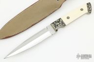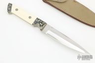 This GHOST RECON Presentation Dagger by Jim Hammond features a double hollow ground symmetrical blade grind, high polish finish on the grinds, satin finish on the flats, .134" blade stock and 1.071" blade depth, full tapered tang construction. The handle has engraved nickel silver bolsters and pins, creamy mammoth ivory scales. Comes with a leather sheath, not original. Numbered "8" on the blade. Excellent fit and finish. The very tip of the blade is blunted, but it is by the tiniest bit, there are a couple cracks in the scales around the pins, otherwise good condition.
