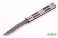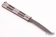 This Balisong by Darrel Ralph features a Damascus recurve blade with false top edge. The handle has channel construction Damascus handles with desert ironwood inlays and a Damascus T-latch. Has some light oxidation on the handles/T-latch/blade stop, otherwise good condition. This one is #10 and only made 25 of these were made.