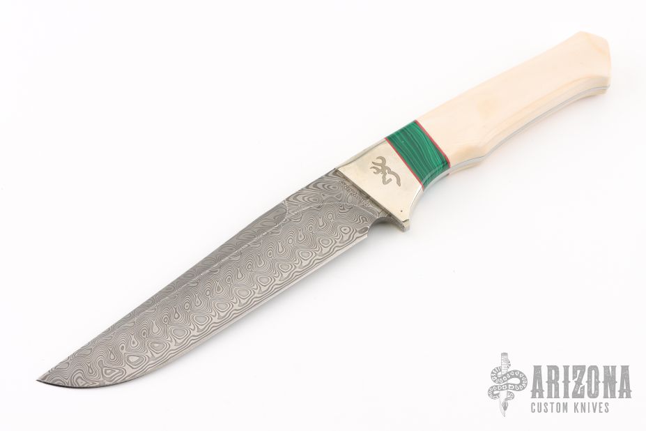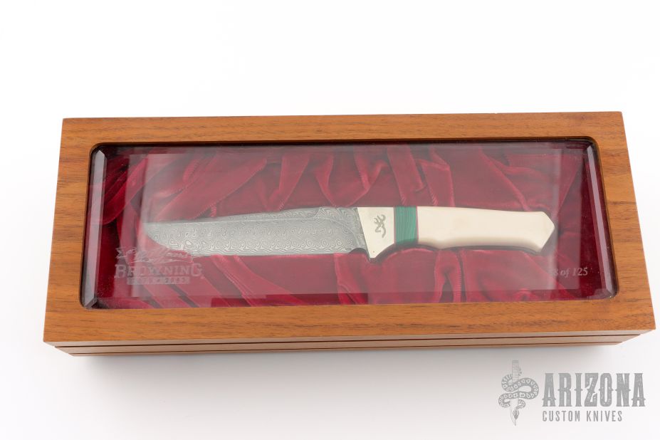 This knife by Browning is #88 of 125, it features a Damascus blade with false top edge, .175" blade stock and 1.343" blade depth, full tapered tang construction. The handle has a nickle silver bolsters, mammoth ivory scales, red spacers on either side of a malachite band. Comes with a wooden display box. Has some light scratches, otherwise excellent condition.