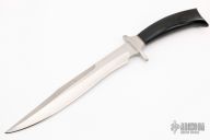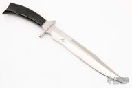 This Fighter by David John Handmade Knives features a satin finished recurve blade with a false top edge and fileworked spine, .279" blade stock and 1.458" blade depth, hidden tang construction. The handle has a 303 stainless steel guard with a buffalo horn grip and red/white spacers. New from maker.