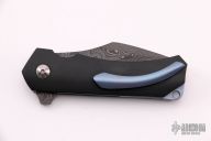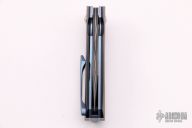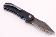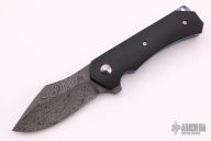 This Little John by Koert Knives features a Chad Nichols San Mai Core Raindrop Damascus blade with swedge and flipper. The handle has Black Diamond Richlite scales, anodized titanium liners, backspacer and tip up clip with hidden screws. Rides on bearings, nice detent, lockup and blade seating. Comes with zippered case and COA. New from maker at the 2019 KYCKS.